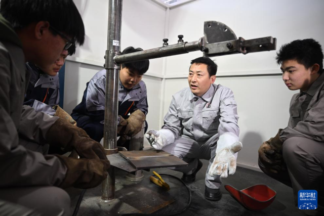 在天津市汉沽中专,张振连(右二)为学生们培训焊接专业技能(2025年2月24日摄)。