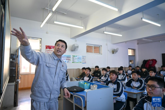 在天津市汉沽中专,张振连(左)为学生们讲解“张振连创新工作室”培养训练模式(2025年2月24日摄)。