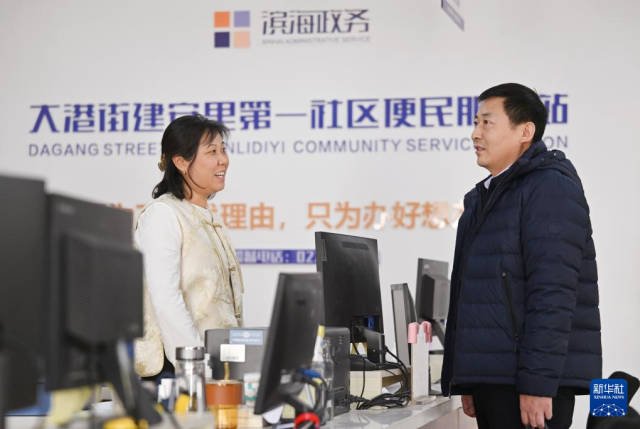 在天津市滨海新区大港街道建安里第一社区便民服务站,张振连(右)和工作人员交流(2025年2月21日摄)。