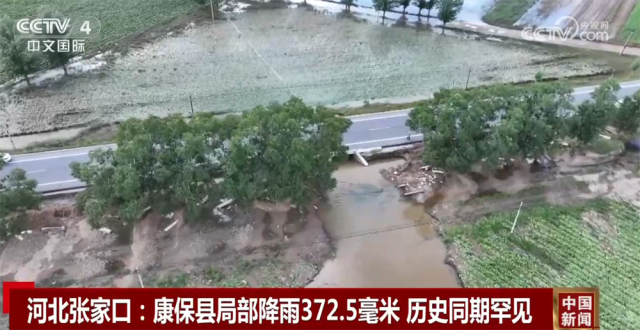 从23日8时至26日18时,张家口市出现分布不均的降水天气。其中,康保县局部降雨量达372.5毫米,为历史同期罕见。27日下午,记者抵达康保县处长地乡现场时,雨水已基本退去,但道路两侧大面积玉米等农作物被淹倒,部分河道内的水流仍然湍急。路面出现不同程度的损毁,部分路基裸露在外。此外,康保县部分蔬菜大棚、牛场等受降雨影响积水较为严重。
