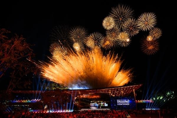 8月17日,第12届世界运动会闭幕式在成都举行。图为闭幕式现场焰火表演。新华社记者 贝赫/摄