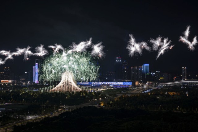 这是8月7日拍摄的开幕式上的焰火表演。新华社记者 冯开华 摄