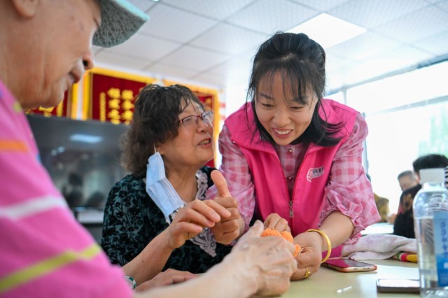 在天津市河西区宾西楼居家养老服务中心,刘缓缓(右)鼓励一名在“老年大学”课上制作手工饰品的老人(5月23日摄)。新华社记者 孙凡越 摄