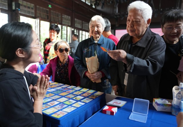 2024年10月11日,在杭州市西湖区北山街道举行的情暖桑榆——孝亲敬老服务进社区活动中,志愿者面向社区居民开展心理健康服务。新华社记者 韩传号 摄