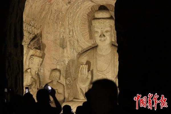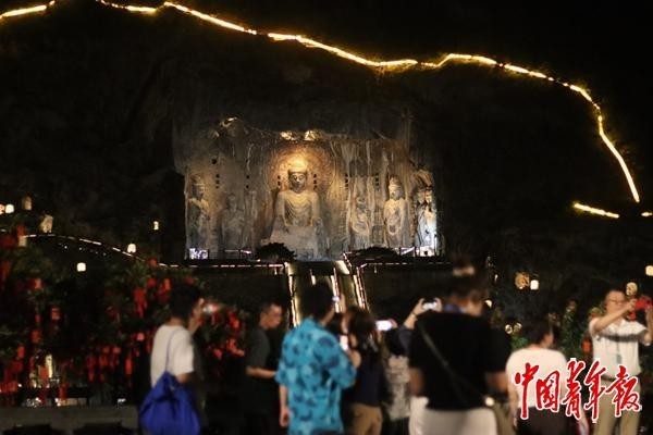 8月19日,河南洛阳,游客在夜色中参观龙门石窟的宾阳洞。中青报·中青网记者 余冰玥/摄