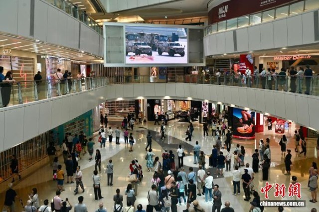 9月3日上午,香港民众在观塘一个商场里观看纪念中国人民抗日战争暨世界反法西斯战争胜利80周年大会的直播。 中新社记者 李志华 摄
