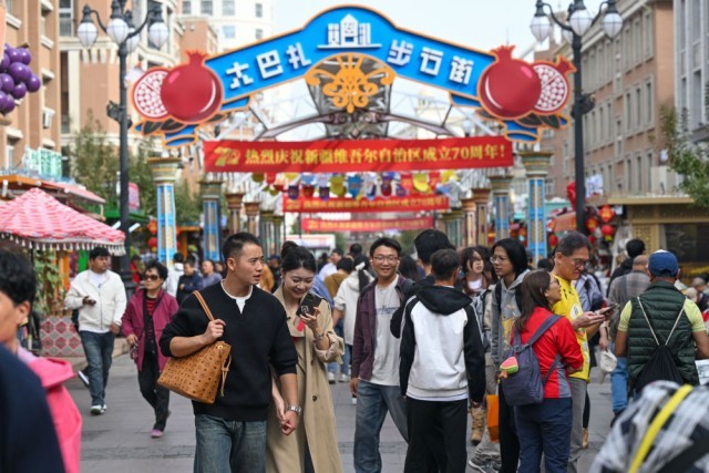10月1日,位于新疆乌鲁木齐市的新疆国际大巴扎处处洋溢浓厚节日氛围,人们在欢声笑语中尽享节日欢乐,感受新疆魅力。