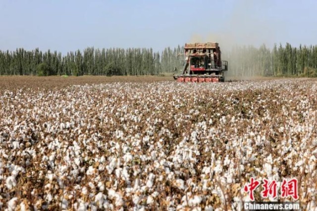 2025年9月28日,新疆阿克苏地区一种植基地种植的长绒棉进入采收季,采棉机在田地里采收并打包。 中新社记者 张宇 摄