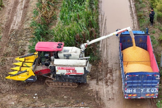 2025年10月8日,河南省商丘市夏邑县会亭镇郭楼村农民驾驶收割机收获玉米。新华社发(王高超 摄)