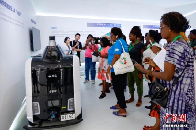 2025年9月16日,中非妇女官员能力建设研修班的25名学员来到杭州的中国人工智能小镇。图为研修班成员参观快递配送无人车。 中新社记者 肖健 摄
