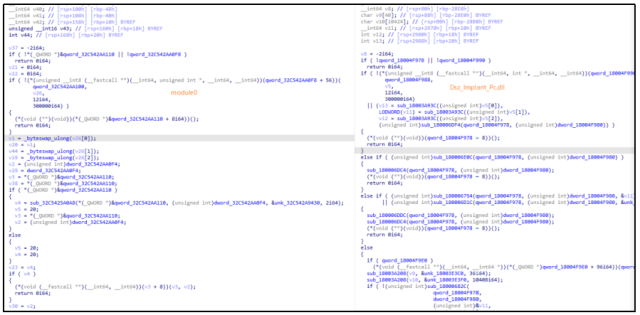 图 module0(左)与Dsz_Implant_Pc.dll(右)代码同源性对比