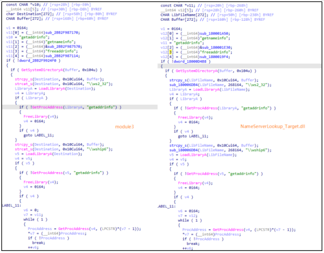图 module3(左)与NameServerLookup_Target.dll(右)代码同源性对比