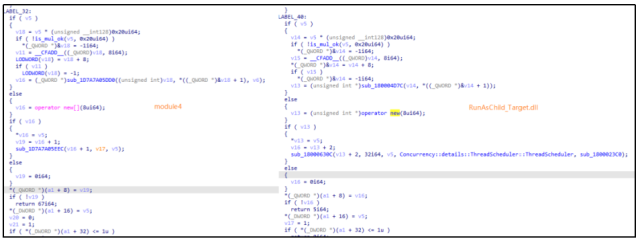 图 module4(左)与RunAsChild_Target.dll(右)代码同源性对比