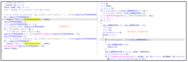 图 module17(左)与Services_Target.dll(右)代码同源性对比