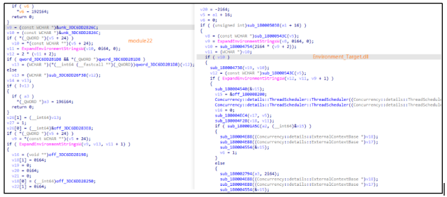 图 module22(左)与Environment_Target.dll(右)代码同源性对比