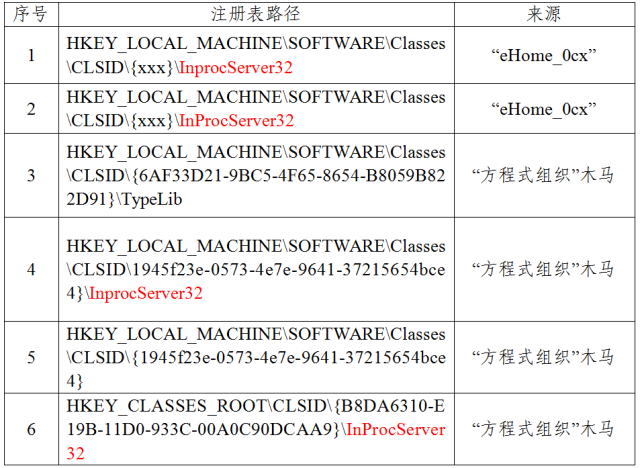“eHome_0cx”的部分驻留文件通过修改注册表InprocServer32键值的方式,劫持了系统正常服务,在系统正常程序启动前加载实现自启动。注册表修改位置与NSA“方程式组织”所使用网攻武器相同,均位于HKEY_LOCAL_MACHINESOFTWAREClassesCLSID下随机ID项的InProcServer32子项。