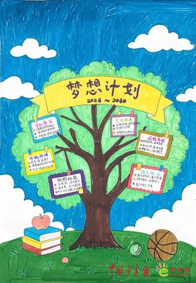 四川省广元市利州区万达实验学校四(2)中队杨姊萌同学绘出了一棵“梦想计划”大树,从学业基石、艺术修养、品德养成、独立担当、体魄强健、视野拓展六大方面,规划了未来五年的成长路径。她说:“要跟着祖国发展的步伐,努力提升自己,长大后接过建设祖国的接力棒。”