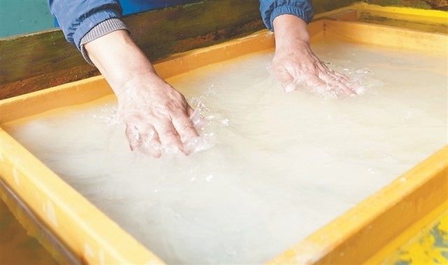 图为阿旺曲央反复搅拌纸浆,持续调和使其更紧密均匀。