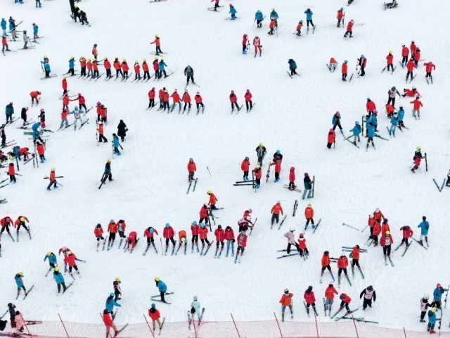 巴东绿葱坡滑雪场雪道上的爱好者↑