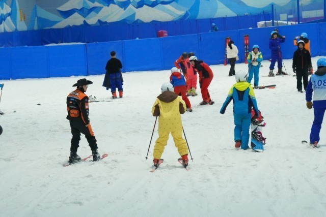 小朋友在昆明热雪奇迹室内滑雪场学滑雪↑
