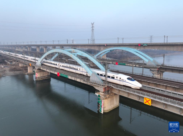1月25日,一列动车组列车驶过江苏省连云港市境内的一座铁路桥(无人机照片)。