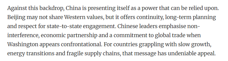 文章认为,在此背景下,中国是可靠力量。中国提供了连续性、长期规划和尊重国家间的交流。中国强调不干涉、经济伙伴关系和对维护全球贸易。对于那些正面临增长缓慢、能源转型和供应链脆弱的国家来说,这一主张具有不可否认的吸引力。另外,中国与美国不同,中国并不要求合作时必须实现意识形态上的一致性。中国提供市场、投资和交流。在不确定的时代,这些反而更体现了一种稳定