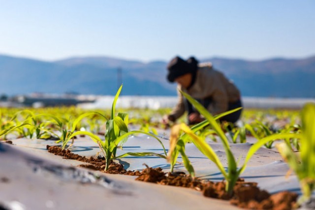 2026年2月1日,农户在云南省红河哈尼族彝族自治州开远市羊街乡的农田里管护发芽出土的玉米。