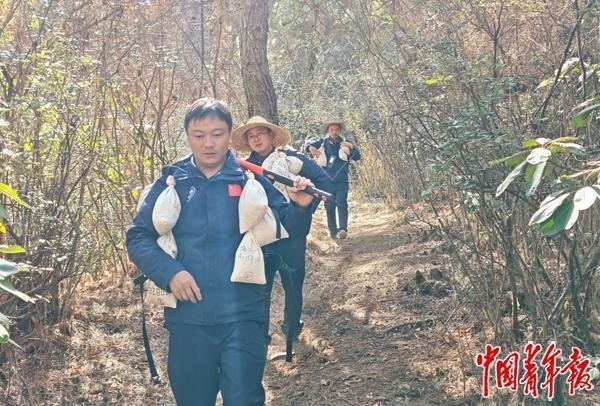“以前参与的野外调查项目多多少少会有点路,但这次云南兰坪金顶铅锌矿外围区块优选调查评价项目的一些点位附近比较原始,有时候汽车停在路边,还要再走1小时进山。”入职昆明中心两年多,90后王天一在这次项目中体验了很多“第一次”:第一次在零下三四摄氏度的冬天开展化探(即地球化学测量)野外工作,第一次采样遇到冻土,第一次连续穿越深沟,第一次遇到很难通过的密集小竹林,第一次采样工作结束后继续背着样品再走1个多小时山路下山,第一次“滑滚”下山。1月28日这天,为了让车通行,他还头一回连赶带抱了一只小牛犊。