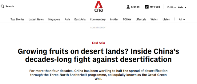 新加坡亚洲新闻台(CNA)网站2月10日刊发深度报道《在沙漠里种水果?中国数十年防沙治沙成就斐然》,通过实地探访展现了中国防沙治沙的卓越成就。报道认为,中国通过持续四十余年的“三北”防护林工程,成功遏制了荒漠化蔓延趋势。