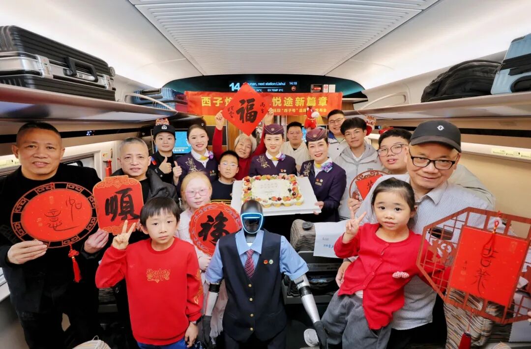 旅客在G41次列车上与机器人及乘务员合影。