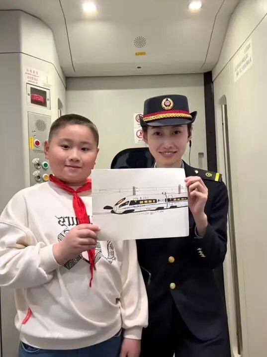 系着红领巾的小旅客,双手捧着一幅自己手绘的高铁画,递到了列车长面前。画面上的列车线条流畅、细节生动,黑黄相间的车身仿佛正带着少年的憧憬向前飞驰。列车长笑着接过这份沉甸甸的心意,与少年并肩站在一起,共同举起画作。