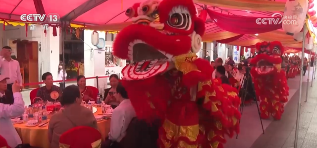 除了品尝特色美食,现场还安排了精彩的醒狮表演等传统节目,锣鼓喧天,舞狮灵动,为这场长桌宴增添了更加浓郁的节日喜庆氛围。这场活动不仅让大家享受了美食,更凝聚了海内外中华儿女的乡愁与情谊。
