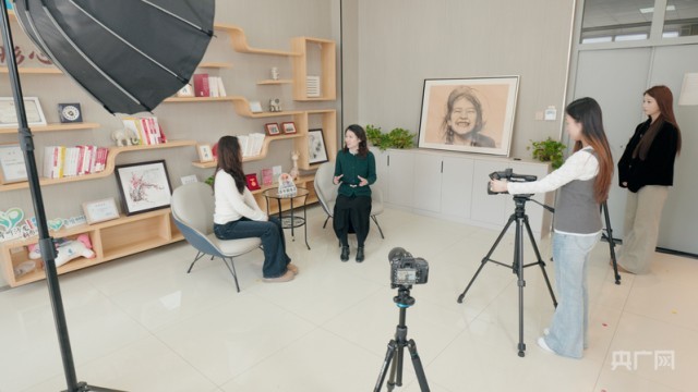 万柯彤(左二)在录制视频中(央广网记者 周思杨 摄)