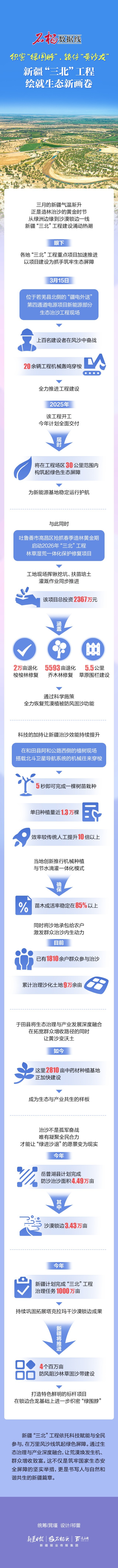 新疆“三北”工程依托科技赋能与全民参与,在万里风沙线筑起绿色屏障。通过生态治理与产业深度融合,让荒漠焕发生机、群众增收致富。这不仅是筑牢国家生态安全屏障的坚实举措,更是书写人与自然和谐共生的新疆篇章。