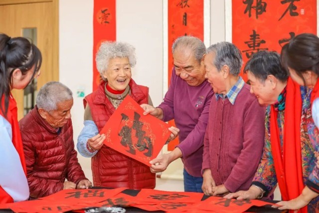 2月10日,在山东省青岛市李沧区颐福养老院开展的“暖意迎新春 温情伴朝夕”主题活动中,老年人展示自己写的“福”字。张鹰摄(中经视觉)