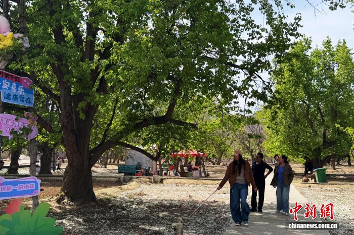 4月10日,宁夏中卫市南长滩村百年梨园,游客漫步赏景。 中新网记者 李佩珊 摄