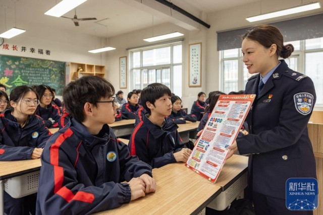 ↑ 4月14日,在江苏省兴化中等专业学校,兴化市司法局法治宣讲员给学生讲解国家安全知识。新华社发(周社根摄)