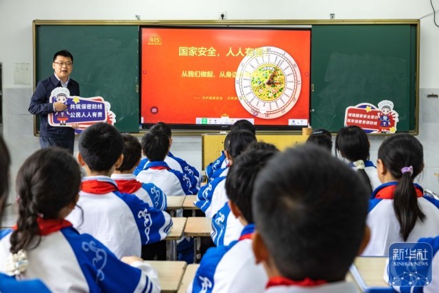 ↑ 4月14日,贵州省安顺市国家保密局宣讲员在安顺市第七小学为学生讲解国家安全知识。新华社发(陈熙摄)