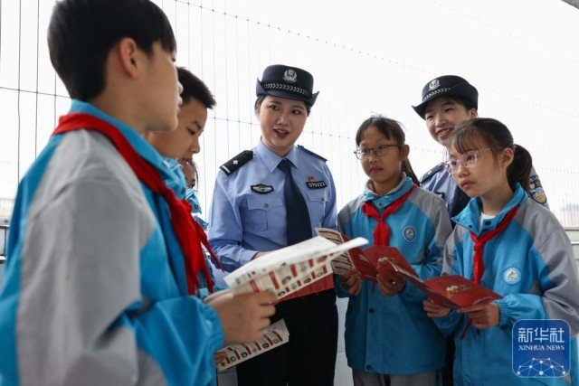 ↑ 4月14日,江苏徐州铁路公安处连云港东站派出所民警为旅客讲解国家安全知识。新华社发(王春摄)