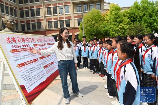 ↑ 4月14日,在河南省沁阳市朱载堉学校,老师为小学生讲解国家安全知识。新华社发(杨帆摄)