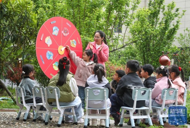 ↑ 4月14日,在江苏省句容市北部新城幼儿园,小朋友通过互动游戏了解国家安全相关知识。新华社发(钟学满摄)