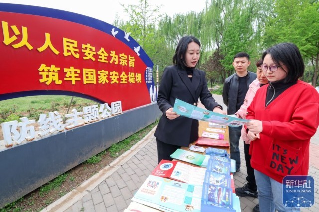 ↑ 4月14日,在河北省石家庄市新华区石太公园,普法工作人员(左一)为群众讲解国家安全相关知识。新华社发(梁子栋摄)