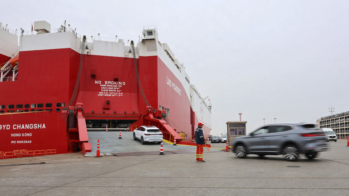 2026年3月24日,在上海外高桥的海通汽车滚装码头,工作人员引导国产新能源汽车驶入汽车滚装船。