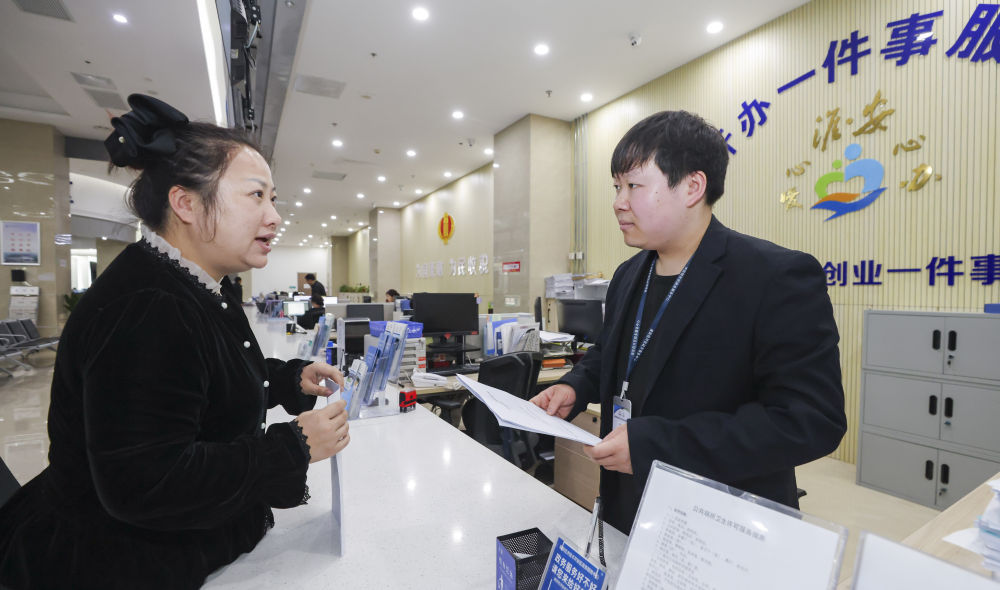 2026年4月9日,在江苏淮安经济技术开发区政务服务中心,市民(左)向工作人员咨询营业执照经营范围、办理流程等信息。