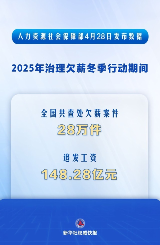 人力资源社会保障部4月28日发布数据显示,2025年治理欠薪冬季行动期间,全国共查处欠薪案件28万件,为147.78万名劳动者追发工资148.28亿元。
