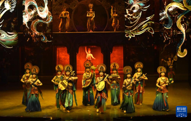 1月9日晚,乐动敦煌(敦煌)文化旅游产业发展有限公司的演员在大型洞窟沉浸式体验剧《乐动敦煌》中表演。